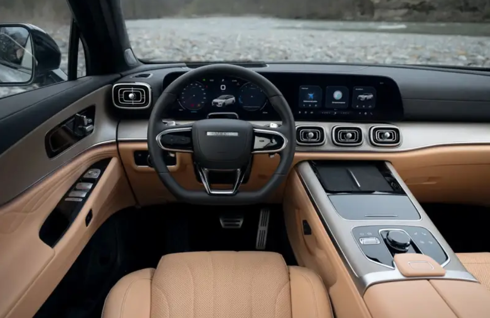 کابین لوکانو L8 کاملاً در سطح شاسیبلندهای لوکس طراحی شده است. استفاده از چرم ناپا، تریمهای فلزی، نورپردازی 255 رنگ و سقف چرمی مات، فضایی آرام و سطح بالا ایجاد میکند.