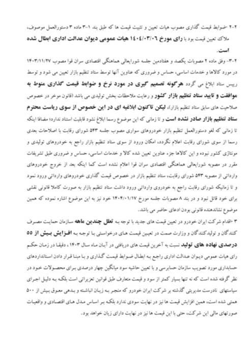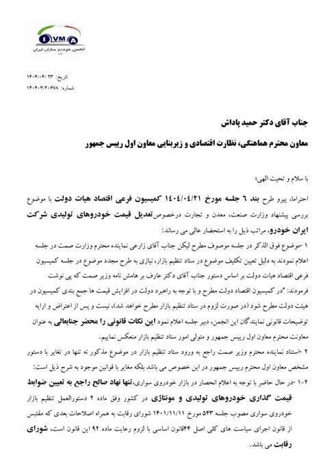 دبیر انجمن خودروسازان ایران با ارسال نامهای به معاون اول رئیسجمهور، خواستار توقف دخالت وزارت صمت در روند قیمتگذاری خودرو شد و شورای رقابت را تنها مرجع قانونی برای تعیین نرخ خودرو معرفی کرد. این درخواست به دنبال رأی دیوان عدالت اداری و افزایش زیان انباشته خودروسازان مطرح شده است.
