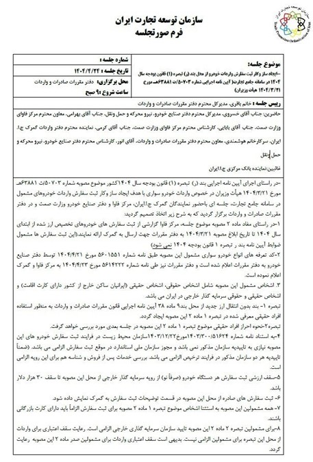 این مقررات نتیجه جلسه مشترک گمرک، سازمان توسعه تجارت، دفاتر مقررات صادرات و واردات و صنایع خودروی وزارت صمت است. موضوع آن، واردات خودرو از محل بند «ر» تبصره یک ماده واحده قانون بودجه ۱۴۰۴ است.